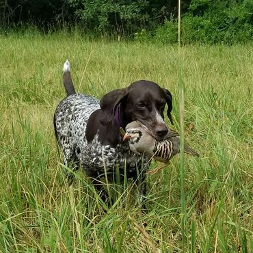 Ellee is a beautiful girl that has all of the natural ability one could ask for and aims to please. Her titles prove her desire to work and just how biddable she is! She has a wonderful temperament and is the biggest lover in the house. Ellee has blessed us with three beautiful litters is and is now retired from breeding and is enjoying her retirement hunting for fun, taking car rides and has first dibs on the couch!