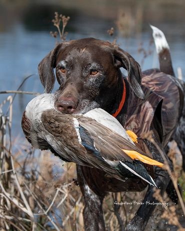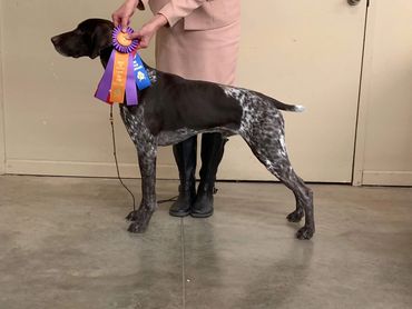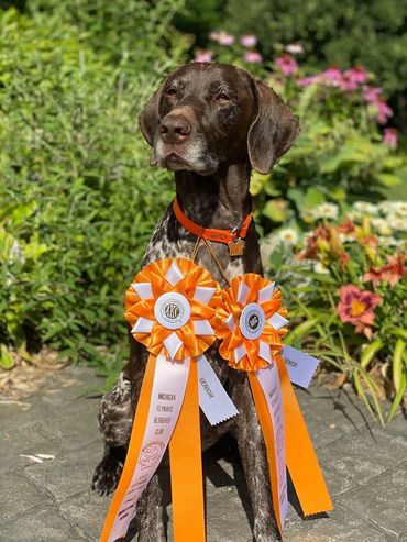 loves the water and is extremely biddable. Jackson is only the 2nd GSP to have ever received both AKC Master titles, upland and retriever, a HUGE accomplishment! Most importantly though he has an wonderful temperament and is a loving family companion to the Nikolas family. In his spare time, Jackson attends school working as a therapy dog with young children.
